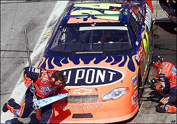 The crew for Jeff Gordon swap tires on the No. 24 DuPont Chevrolet.